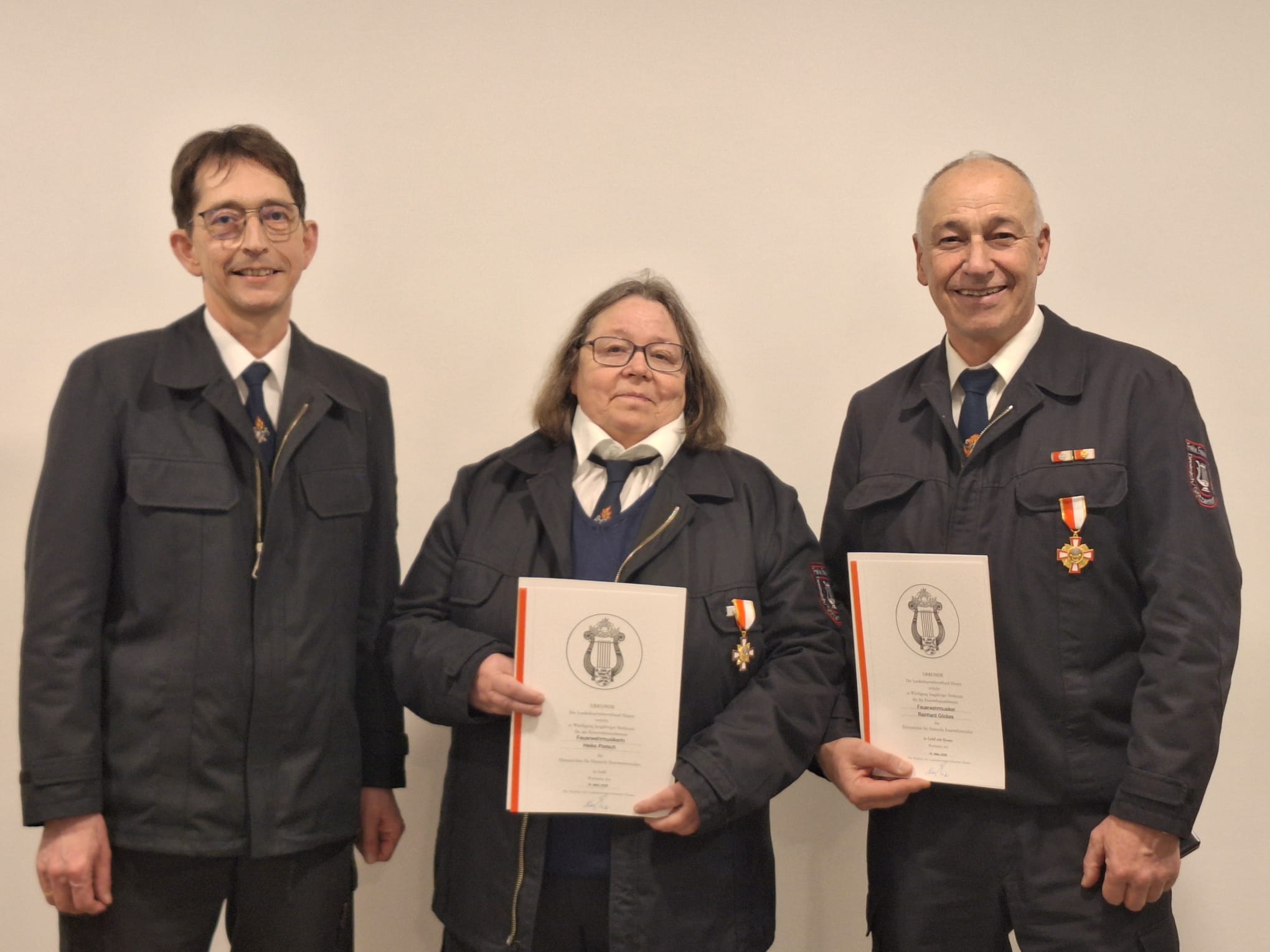 Das Ehrenzeichen für Feuerwehrmusiker des Landes Hessen in Gold für 40jährige aktive Mitgliedschaft im Feuerwehrverein wurde an Heike Pietsch verliehen. Für 50jährige aktive Mitgliedschaft wurde Reinhard Göckes mit dem Ehrenzeichen in Gold mit Kranz ausgezeichnet.